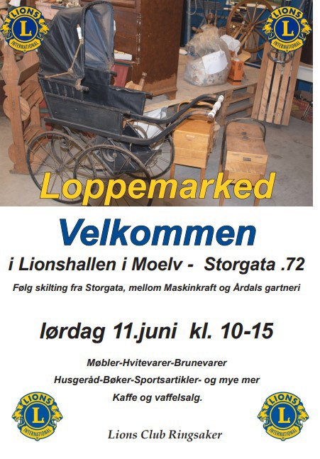 Vi gleder oss til loppemarked igjen, som altså finner sted lørdag 11. juni kl. 10.00 – 15.00 i Lionshallen i Storgt 72 i Moelv.